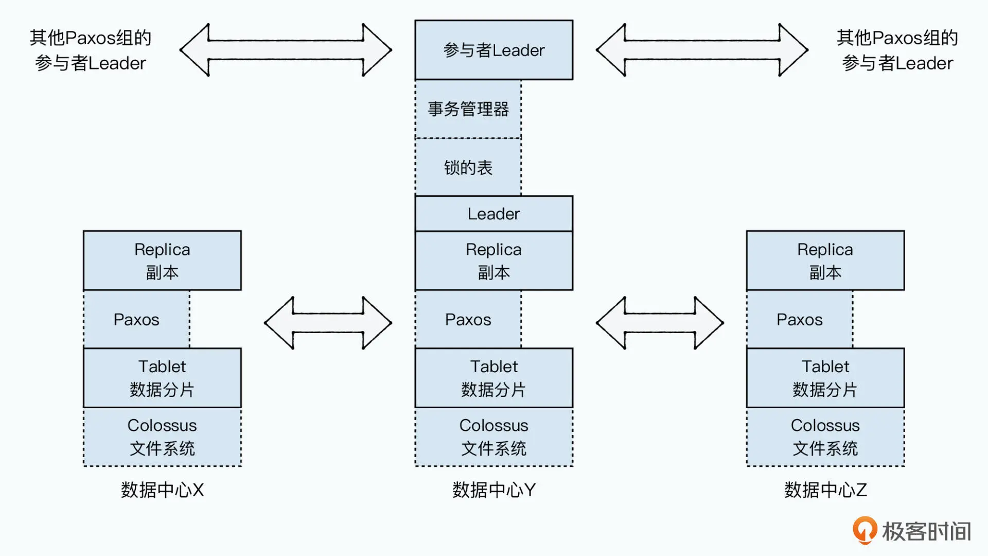 每个 Spanserver 上,会有一个事务管理器,用来支持分布式事务。这个事务管理器,就是一个参与者 Leader(Participant Leader),这个参与者 Leader 会和其他的参与者 Leader 协商,来完成事务的两阶段提交