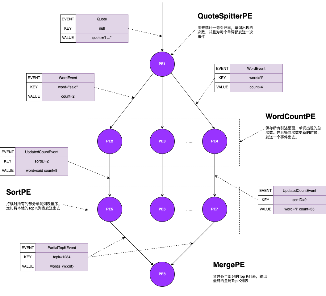 S4 把所有的计算过程,都变成了一个个处理元素(Processing Element)对象,简称为 PE 对象,每一个 PE 对象,都有四部分要素组成:功能、能够处理的事件类型、能处理的事件的键值,流式的数据处理,就是由一个个 PE 组成的有向无环图(DAG)