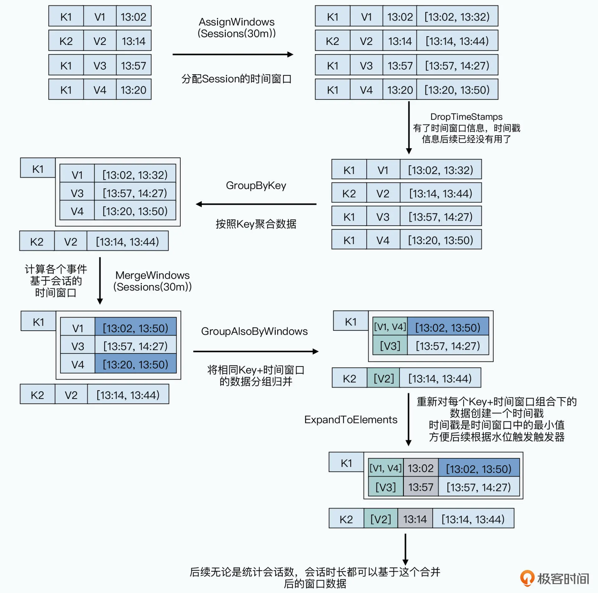 - GroupByKey,地位则是 MapReduce 里的 Shuffle 操作。把相同的 Key 汇总到一起,然后再通过一个 ParDo 下的 DoFn 进行处理